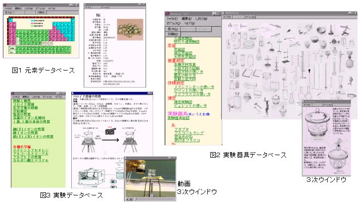 開発した教材は次の(1)〜(4)の各ソフトウェアである。(1)元素データベースは、原子量、電子構造、原子半径、イオン化エネルギー、密度、融点、沸点、同位体等の元素情報および単体の写真、単体の性質などの動画を同時に瞬時に表示するソフトウェアである(図1)。(2)化学資料データベースは、化合物の融点、沸点、酸の解離定数等の数値データ、反応系統図といった化学データを瞬時に表示するものである。化学便覧や実際に学校で使用されている資料集などを参考に授業で活用できそうなものを中心に作成した。(3)実験器具データベースは、高校化学で必要と思われる実験装置(例えば蒸留装置)および一つ一つの実験器具について、その絵や写真、その使用方法等を瞬時に表示するものである。個々の実験器具については器具名を五十音順に整列した索引を選択する方法と、1つのウインドウ画面に全器具のミニ画像を表示して、そのミニ画像をマウスで選択する方法(図2)を選ぶことができる。(4)化学実験ソフトウェアは、学校で行われている実験の操作方法、化学反応、実験結果等を写真や動画で解説する。つまり実験の模擬体験ができるソフトウェアである(図3)。実験は教科書等を参考にして、標準的な実験を選択し作成した。実験の事前学習や実験後の内容確認、および、未実験者への学習補助として活用できる。