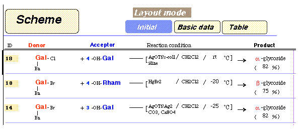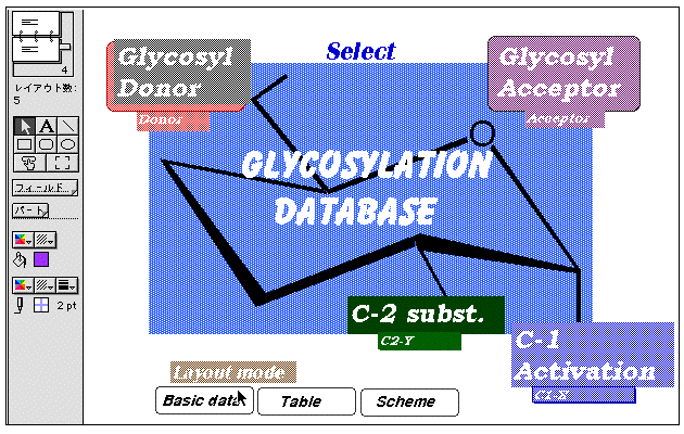 リレーショナル機能をもつファイルメーカーpro Ver. 4(クラリス社) を用いて糖鎖合成に有用なグリコシル化反応データベースを作成した。 糖鎖の種類,立体化学的条件を指定して最適反応条件を検索することができる。 検索結果を視覚的に表示する。また,糖鎖合成についても学習できる。 | |